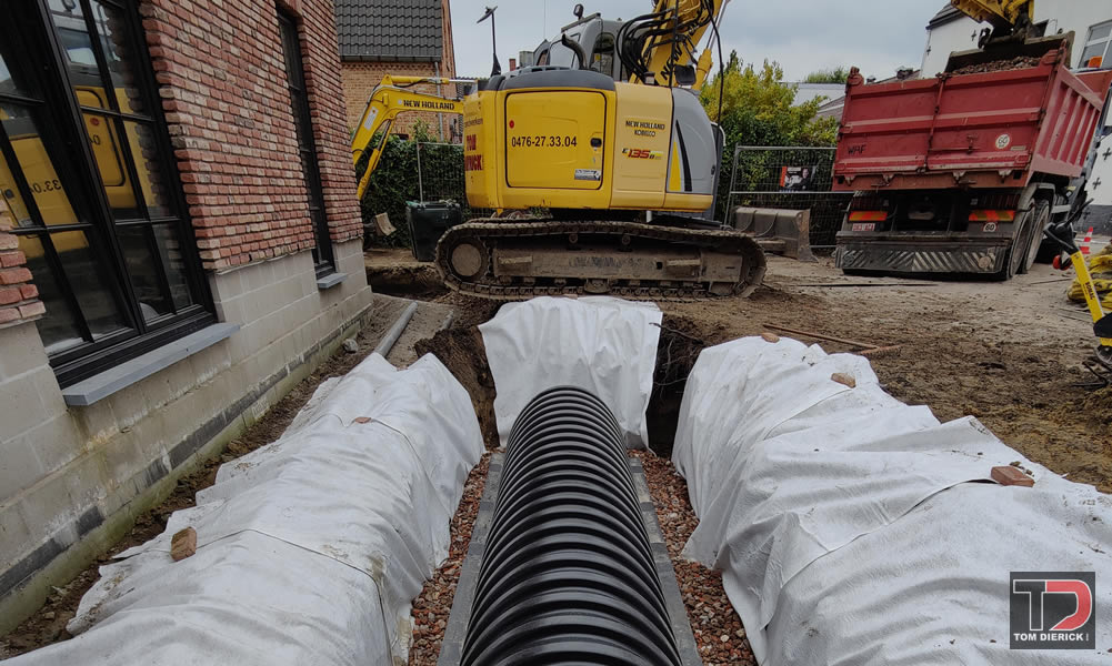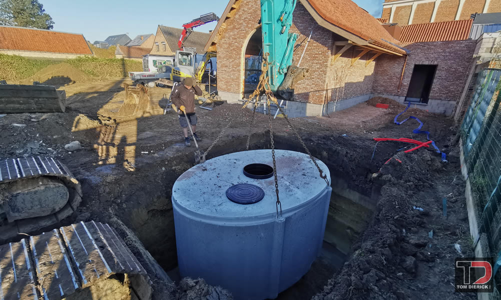 Daarna hebben we een kruipkelder gegraven. Nadat de ruwbouw er stond hebben we de woning voorzien van de nodige regenwater- en septische putten. Ook is hier een infiltratietunnel aangelegd om het water van de oprit terug te infiltreren in de grond. We hebben de woning voorzien van de nodige riolering. Na de riolering zijn we begonnen met de onderfunderingen voor de paden, terrassen en de oprit. Als laatste hebben we de grondwerken en nivelleringswerken voorzien voor de tuin. De eyecatcher is natuurlijk de vijver die met zeer mooie vormen werd aangelegd.